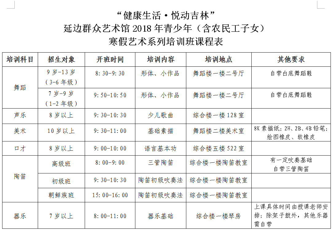 为了丰富我州青少年寒假生活,更好地关心、关注未成年人特别是生活困难群众家庭子女成长,挖掘、培养其文化艺术的兴趣爱好和潜质,延边群众艺术馆计划于2018年1月8日-26日举办“延边群众艺术馆青少年(含农民工子女)寒假艺术系列免费培训班”。