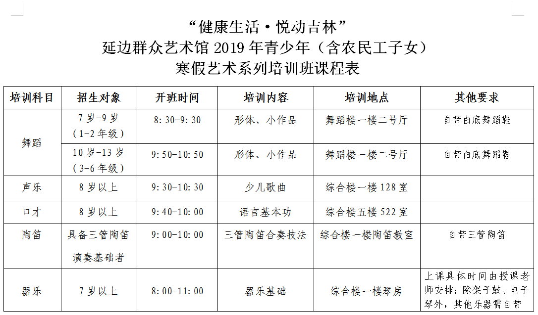 为了丰富我州青少年寒假生活,更好地关心、关注青少年全方面发展,广泛培养青少年儿童的兴趣爱好,解决贫困家庭子女对艺术类学习的需求,营造全民爱文艺,全民懂文化的良好氛围,推进文化旅游兴州的进程。延边群众艺术馆计划于2019年1月7日-25日举办“延边群众艺术馆青少年(含农民工子女)寒假艺术系列免费培训班”。